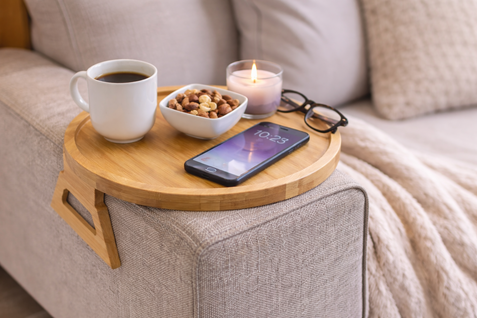 The Striveira Clip-On Sofa Tray turns your couch arm into a stable surface for drinks, snacks, remotes, and more — without the bulk.